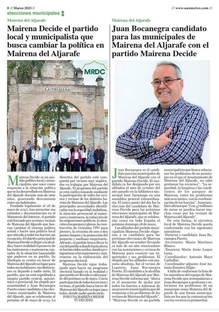 Mairena Decide ,MRDC, quiere agradecer a tod@s l@s mairener@s que con su voto en las pasadas elecciones municipales nos han otorgado su confianza. Esta confianza va a servir para que nuestro presidente y concejal electo, Juan Bocanegra Puerto, lleve al consistorio municipal nuestro programa electoral. Este partido nace por la preocupación de l@s vecin@s de este municipio, con la necesidad de un cambio en la actual política de nuestro Ayuntamiento.