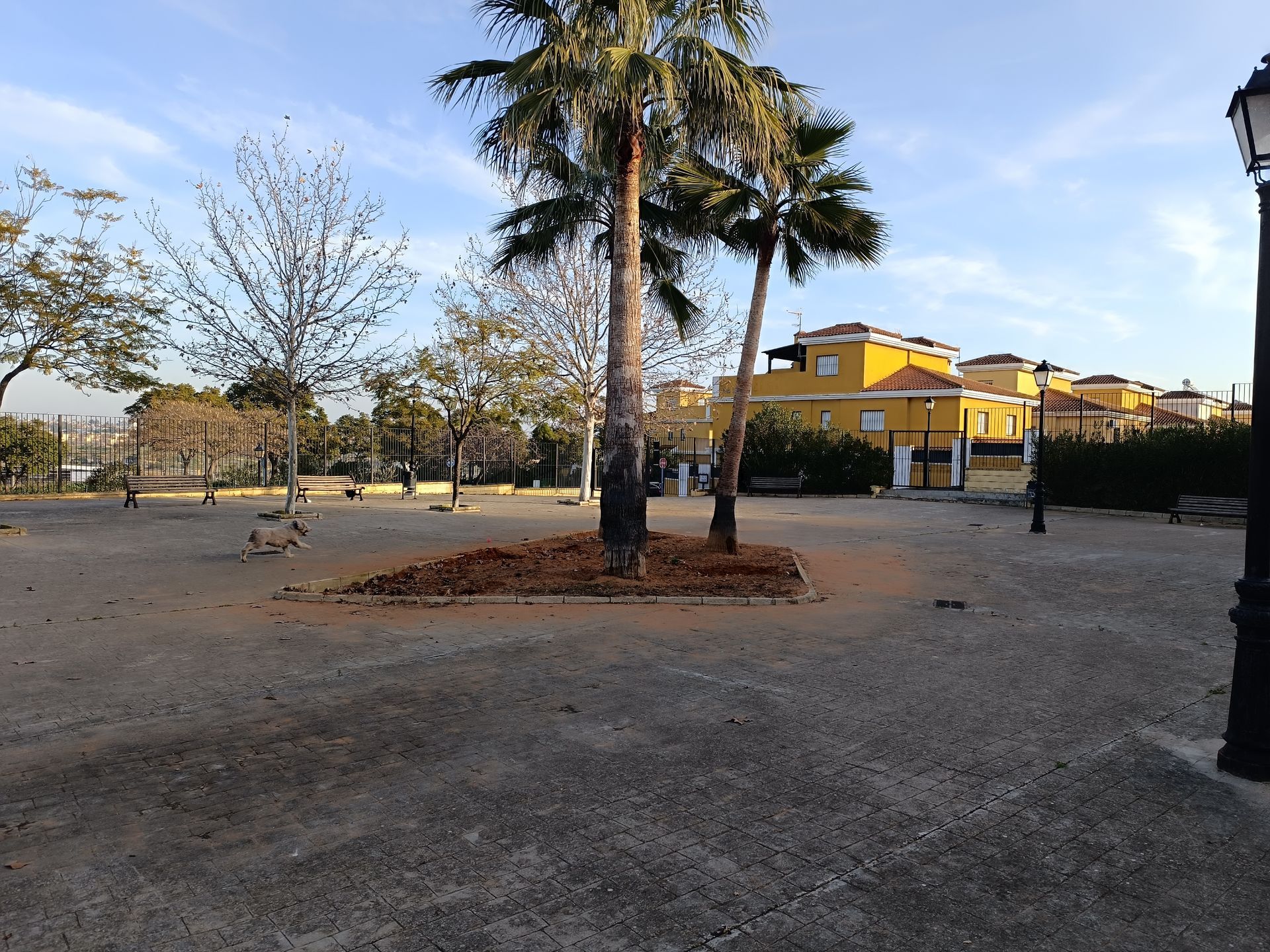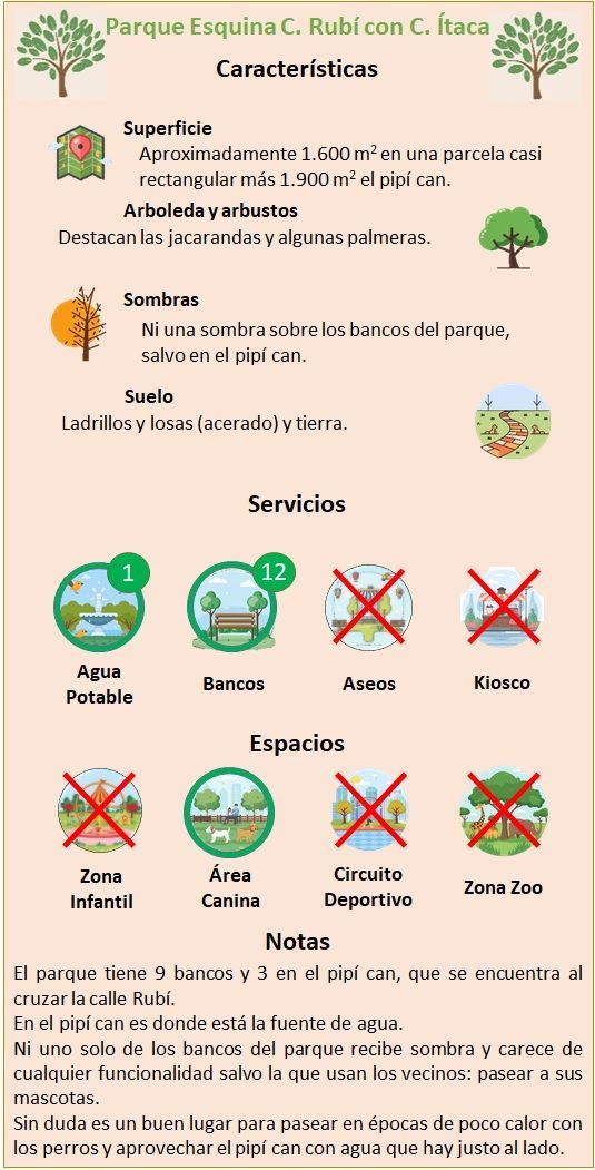 Por un lado, en la esquina de Calle Rubí con Calle Ítaca hay una explanada flanqueada por jacarandas con tres palmeras en el centro. Salvo nueve bancos, no hay nada más. Ni una sola sombra proyecta sobre dichos bancos, por lo que el uso principal que dan a esta plaza los vecinos es pasear a sus perros.